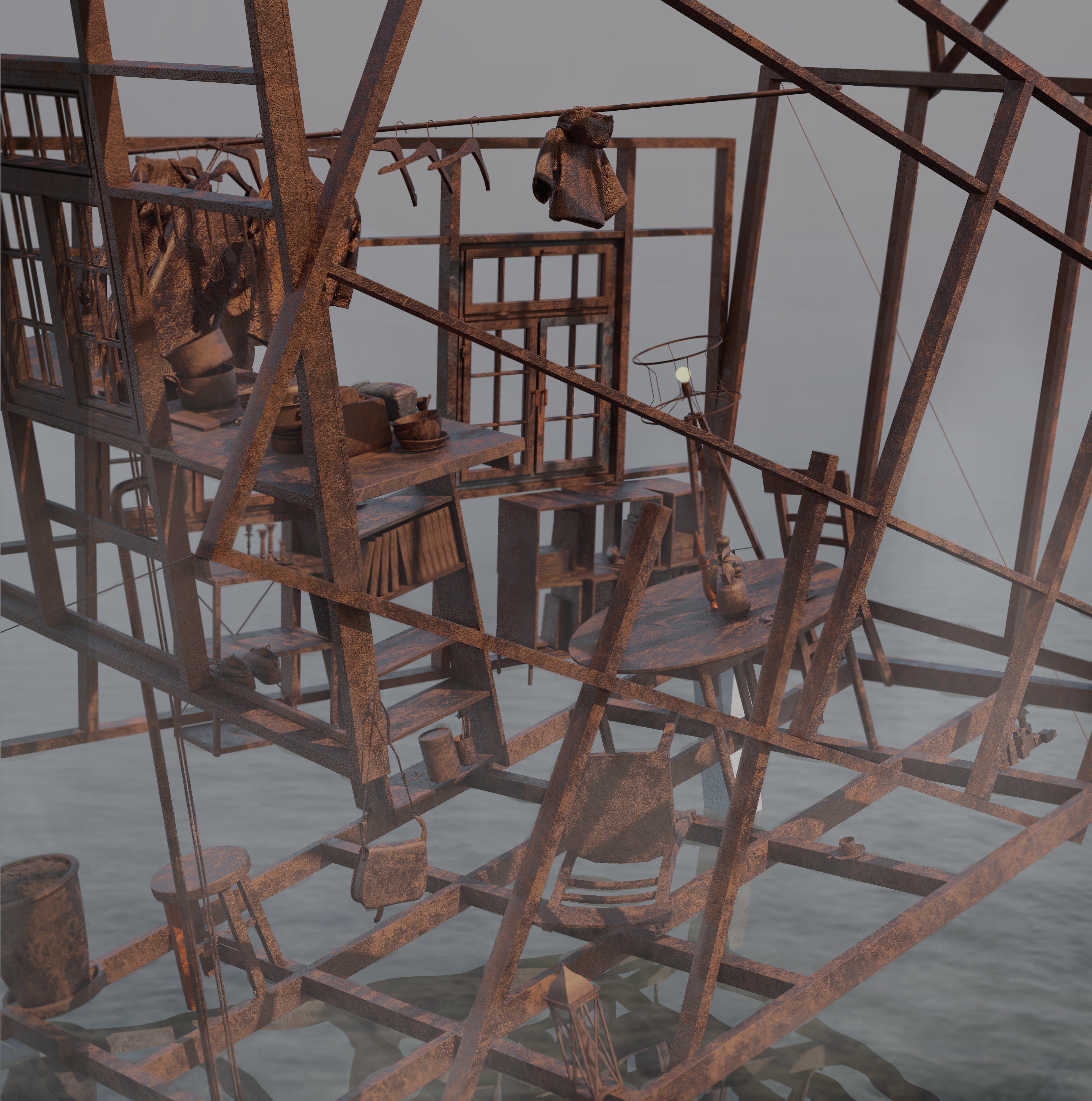 small home has its walls removed to expose a fractured domestic scene.